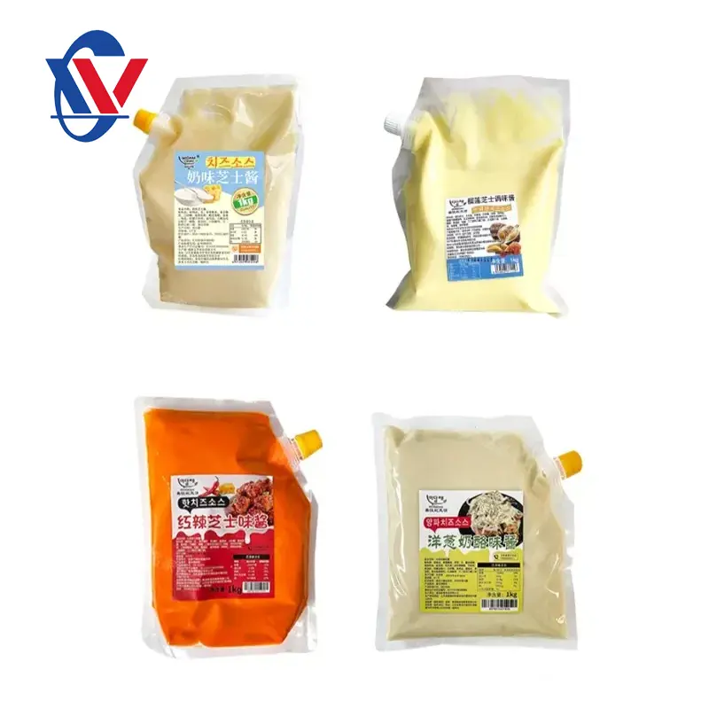 Oftaj formoj de likva saŭco plataj sakaj pakaj sakoj inkluzivas triflankajn sigelitajn kaj kvarflankajn sigelitajn platajn sakojn. Ĉi tiuj sakoj estas ofte uzataj por paki diversajn likvajn saŭcojn, kiel varman potan bazon, kondimentan saŭcon, ktp. La presado kaj logoo sur la sako devas esti klare videblaj, inkluzive informojn kiel produkta nomo, ingrediencoj, breta vivo, ktp., Por ke konsumantoj komprenu la produkton.