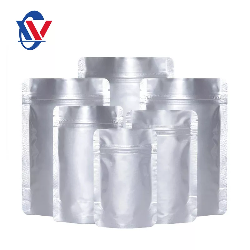 Aluminiaj foliaj sakoj (kontraŭstataj aluminiaj foliaj sakoj, sakoj de aluminiaj pakaĵoj), produktaj aspektoj: opaka, arĝenta blanka, kun reflekta brilo, bona baro, varmega sigelado, lumigado, alta temperaturo-rezisto, malalta temperaturo-rezisto, oleo-rezisto, bonodora retenado; ne-toksa kaj bongusta; molaj kaj aliaj trajtoj. Produkta Strukturo: PET/AL/PET/PE. Produktoj de diversaj kunmetitaj materialoj kaj dikecoj povas esti agorditaj laŭ bezono. Stokada media temperaturo ≤38 ℃, humido ≤90%. Produktaj Specifoj: Dikeco 0.10mm kaj 0.14mm, triflanka sigeliĝo, rando-sigelado 10mm, produktaj specifoj kaj dimensioj povas esti agorditaj laŭ klientaj bezonoj.